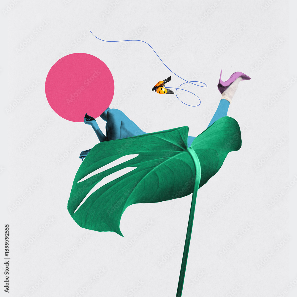 Poster. Contemporary art collage. Female body flying on tropical leaf chasing ladybug under pink sun. Concept of beauty, nature, freedom, freshness, summer, green energy, fruit, balance.