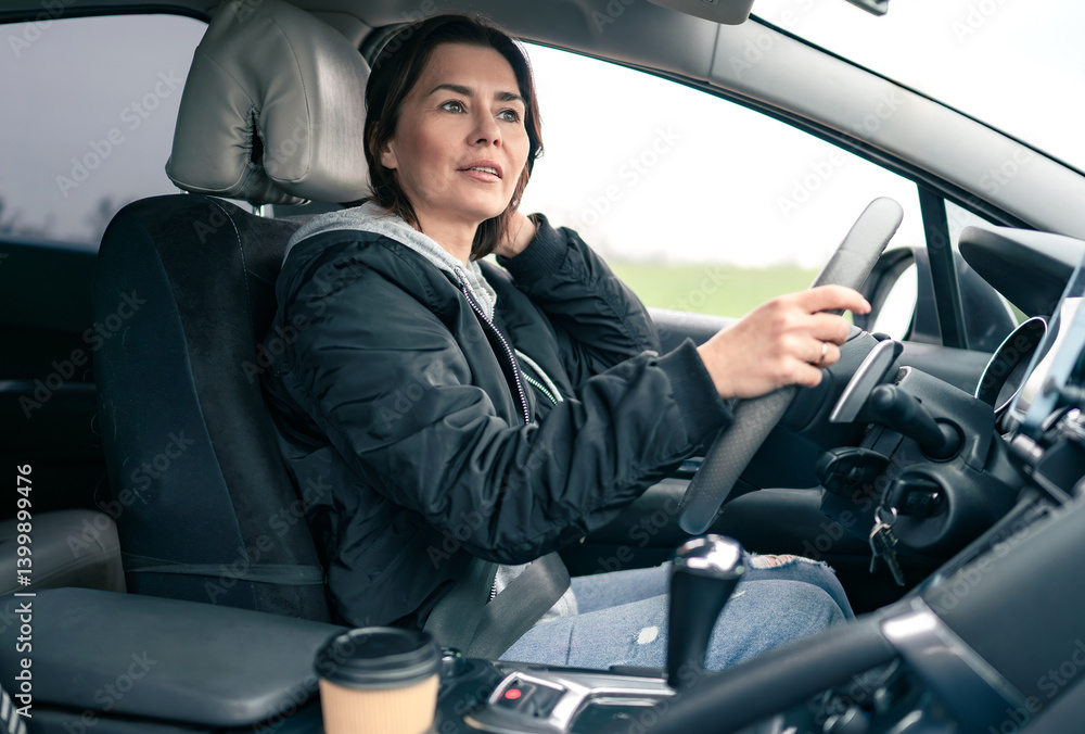 Woman Driver On A Long Car Trip In A Modern Car