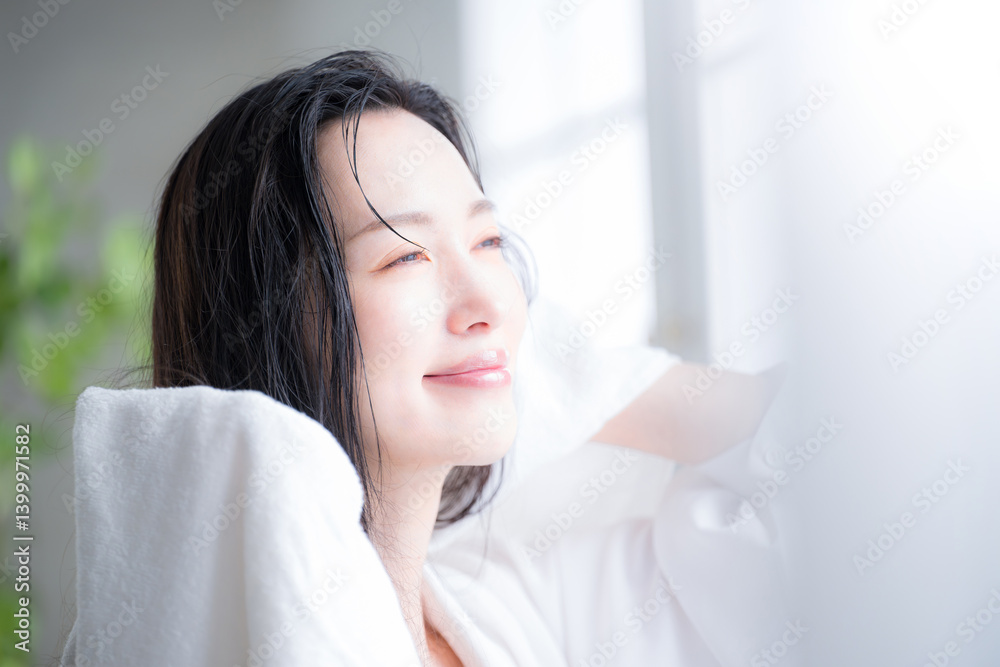 逆光の窓辺で朝やお風呂上りなどに濡れた髪を乾かすタオルドライする笑顔の女性の横顔