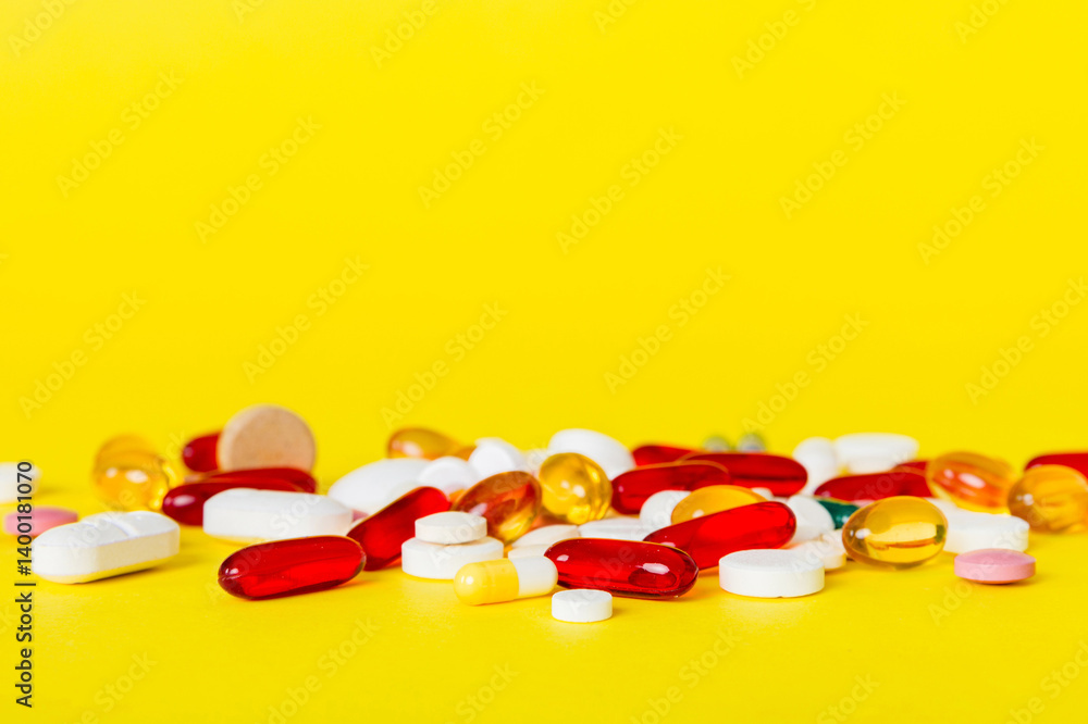 Many different colorful medication and pills perspective view. Set of many pills on colored background