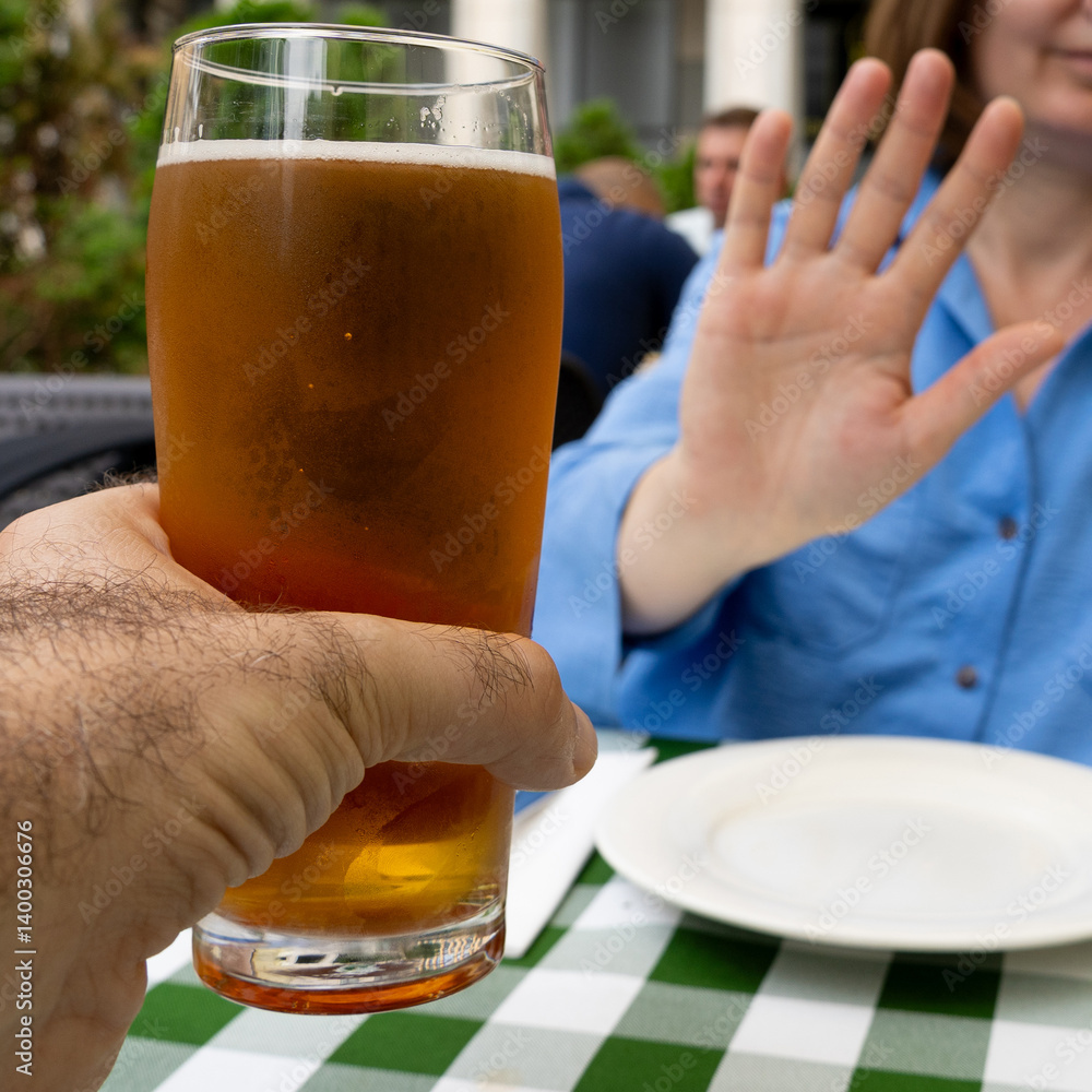 Reject a glass of beer, woman refusing alcohol, stop drinking, sobriety concept, saying no to beer glass
