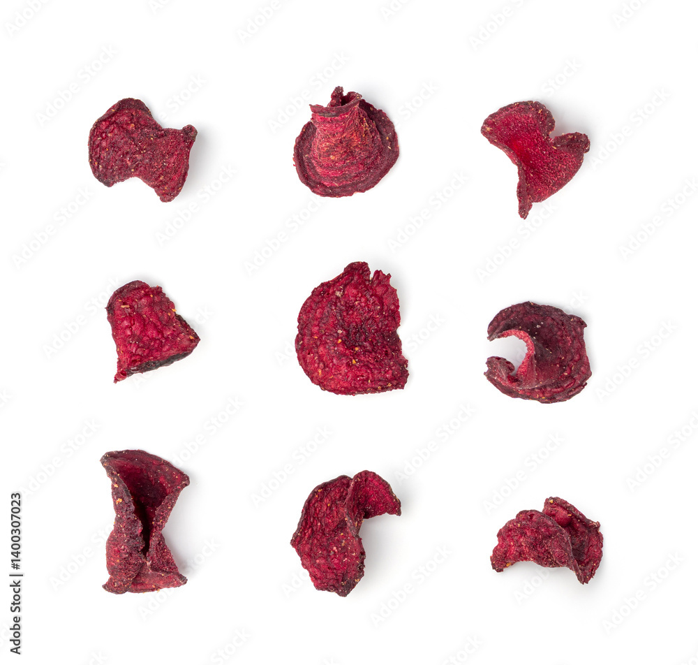 Dry beetroot chips isolated, dried sliced red beet flakes pile, beet root pieces and chips