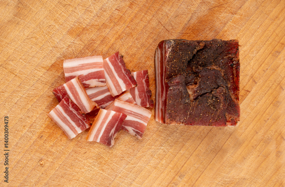 Cured carbonara pork isolated, raw smoked bacon, streaky brisket on white background