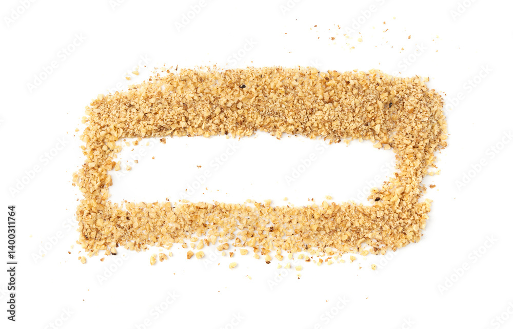 Grated wallnut , broken roasted walnuts, heap of nuts crumbs, whole kernel pieces, fractions
