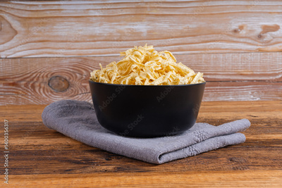 Passatelli spatzle pasta in bowl, raw spaetzle noodles, dry homemade german macaroni