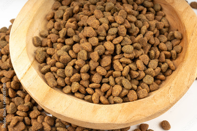 Dry pet food close up, dog kibble pile in wood bowl, puppy pellets macro, small canine protein