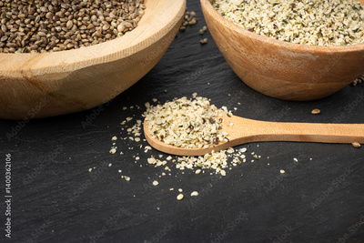 Shelled hemp seeds pile, peeled cannabis grains, marijuana kernels without peel