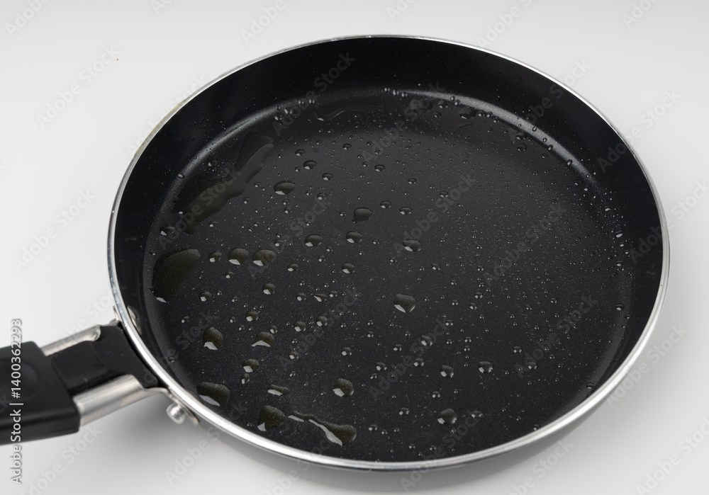 Oil drops on frying pan texture, water splash on black non-stick coating, drop on non stick griddle
