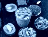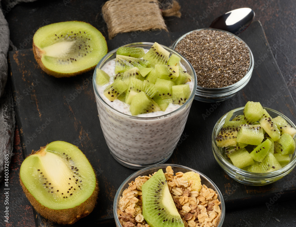 Glass of chia seed pudding mixed with diced kiwi is on a black surface