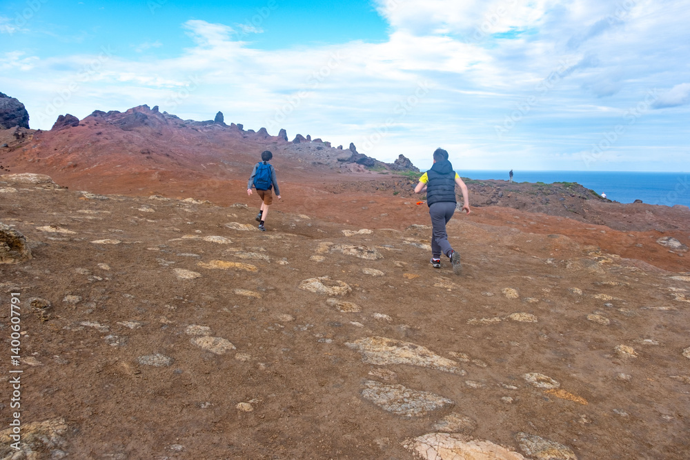 two teenagers preteen boys explore Madeira, Young travelers admire breathtaking volcanic Madeira, kids adventure, discovery archipelago landscape, island travel, wanderlust vacation, Portugal