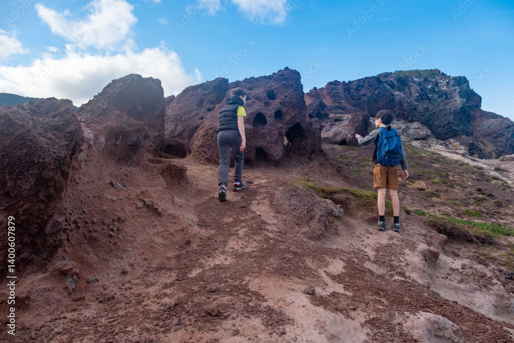two teenagers preteen boys explore Madeira, Young travelers admire breathtaking volcanic Madeira, kids adventure, discovery archipelago landscape, island travel, wanderlust vacation, Portugal