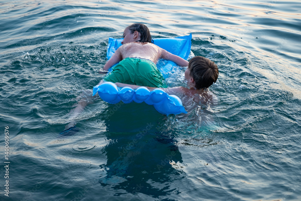 Two children swimming in sea, adrift on blue inflatable raft, accident in open water, inflatable raft swept farther and farther out to sea by strong current, water safety