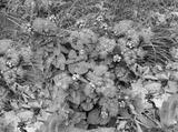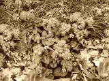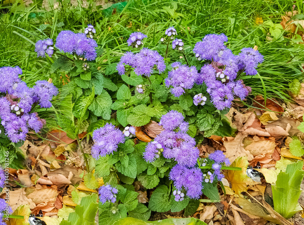 bushes of flowers Ageratum mexicanum of the Blue Ball variety among dry autumn foliage. Delicate fluffy blue inflorescences contrast with the warm shades of withering vegetation. Autumn concept.