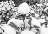 A chrysanthemum flower with bright pink petals is partially covered with snow. The white snow cover contrasts with the rich color of the petals. Postcard theme