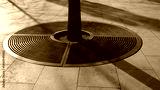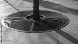 Circular tree grate surrounds tree on pedestrian sidewalk, allowing water infiltration while offering protection and clean look in an urban setting