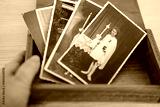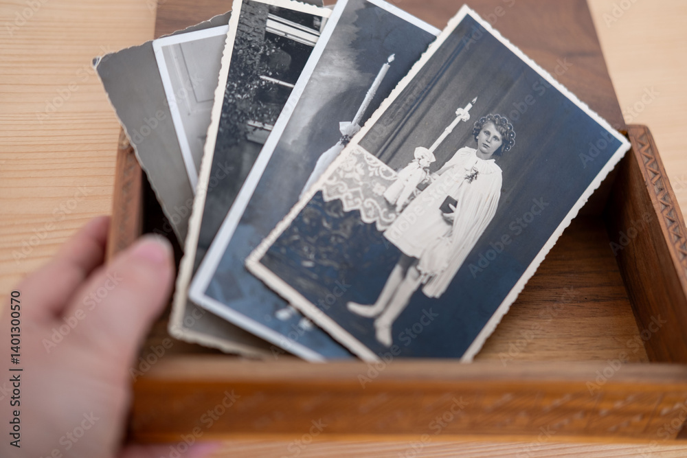 Close-up female hands holding vintage black and white photos, reminiscing about family history and forgotten moments, Sorting through old photographs, historic archive, concept genealogy, family tree
