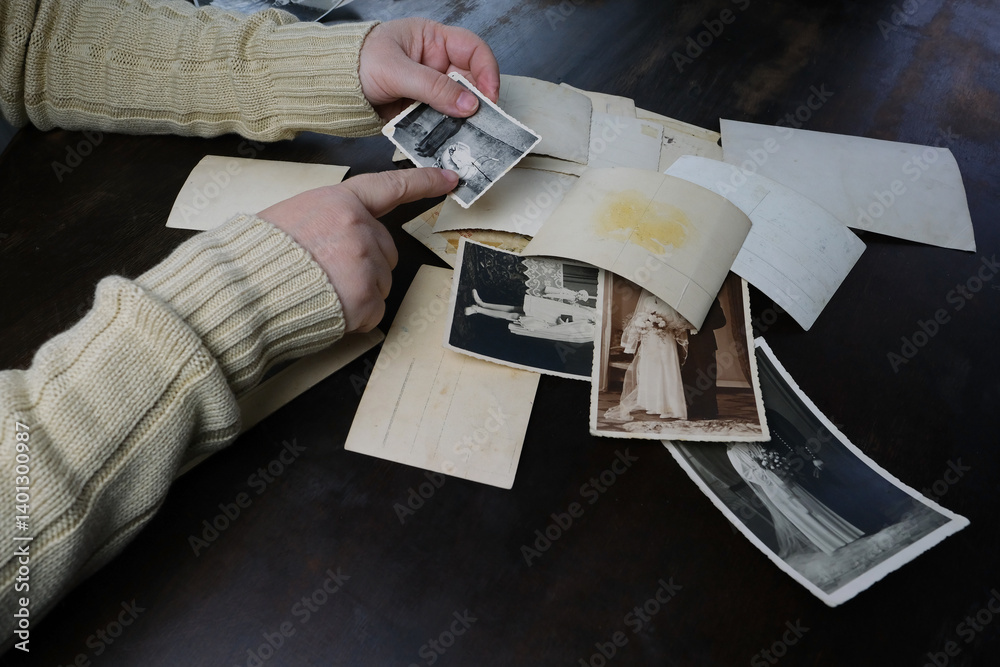 female hands fingering old photographs of 1950s, vintage monochrome photos, concept of genealogy, memory of ancestors, family tree, nostalgia, childhood, remembering
