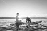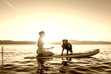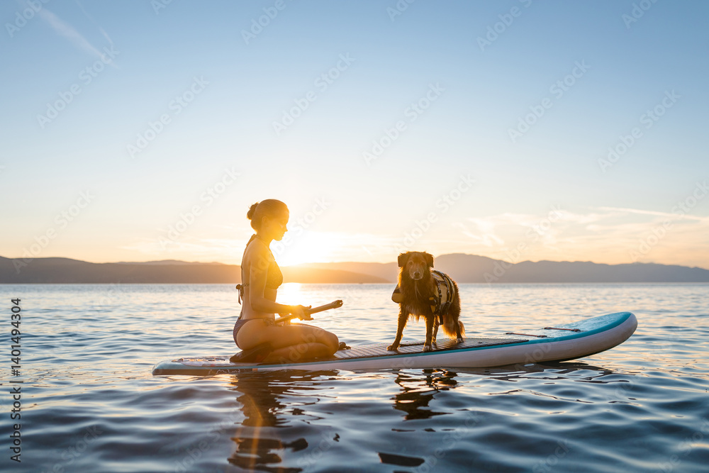 Girl with a dog sitting on a sup board surfing on a lake in a sunset. Dog is wearing a life vest and girl is wearing a swimsuit
