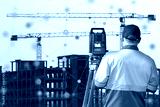 Surveyor with a total station collects geospatial data at a building site with cranes and digital overlay. Scene relates to smart construction and civil engineering.