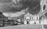 The beautiful Venetian square called Campo Santi Giovanni e Paolo, Venice, Italy, with the facade of the Basilica San Zanipolo, in black and white
