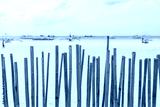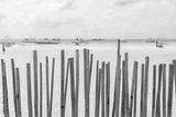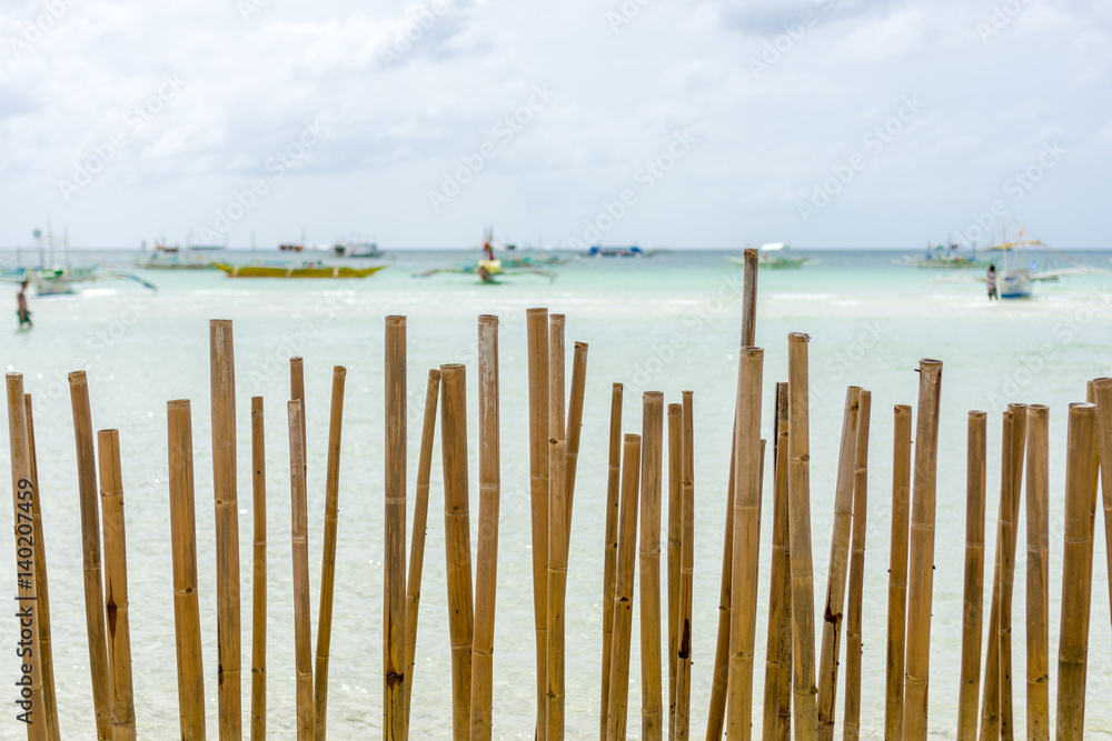 Looking through a bamboo pole barrier fence in a tropical island white sand beach out to a calm crystal clear sea with pump boats anchored in the distance with foreground focus.