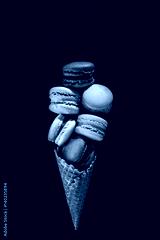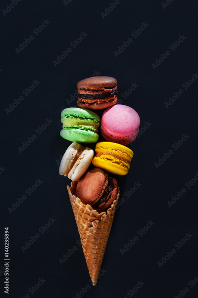 Multicolored cake macarons or macaroon in the waffle cone in the form of ice cream on the black background. Top view.