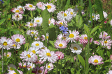 Daisies in a garden. The botanical name Bellis perennis, known as English Daisy or Lawn Daisy. Spring Background with daisies.