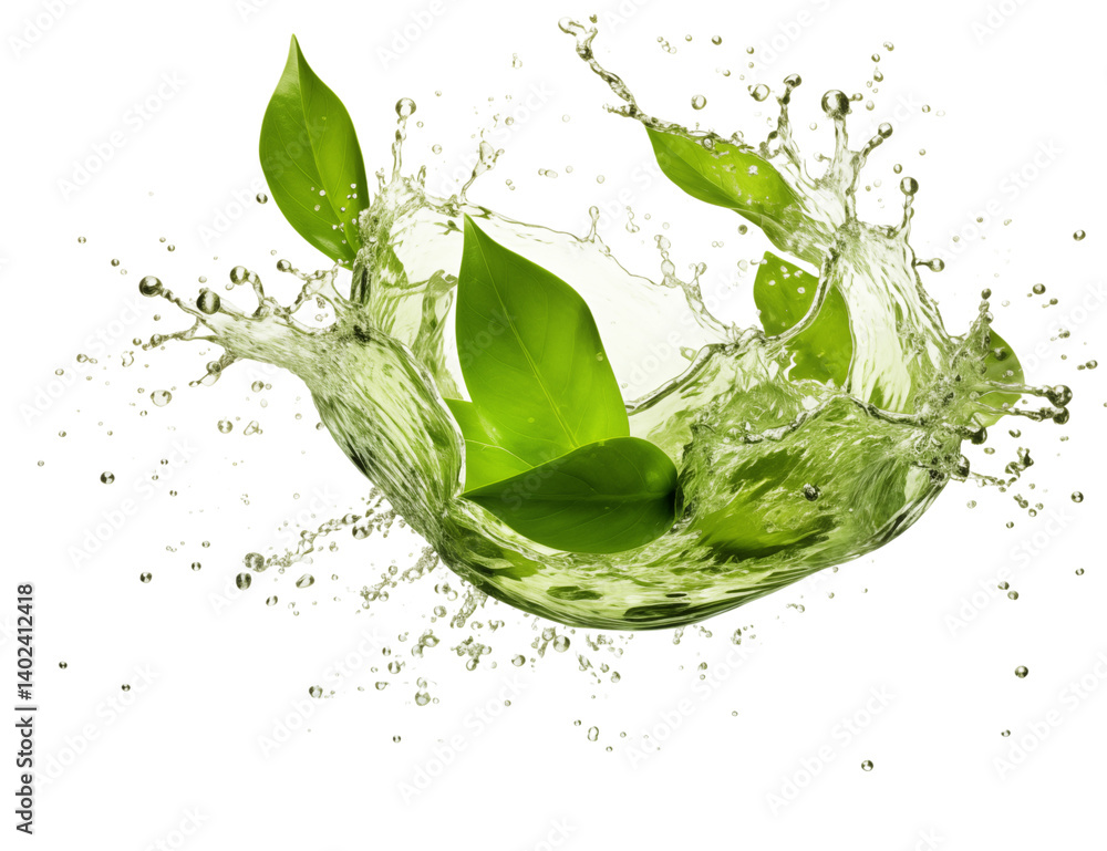 A vibrant splash of water with bright green leaves against a in a dynamic composition on transparent background png