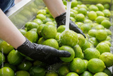 Gloved hands washing green limes under water stream at fruit cleaning station.