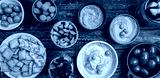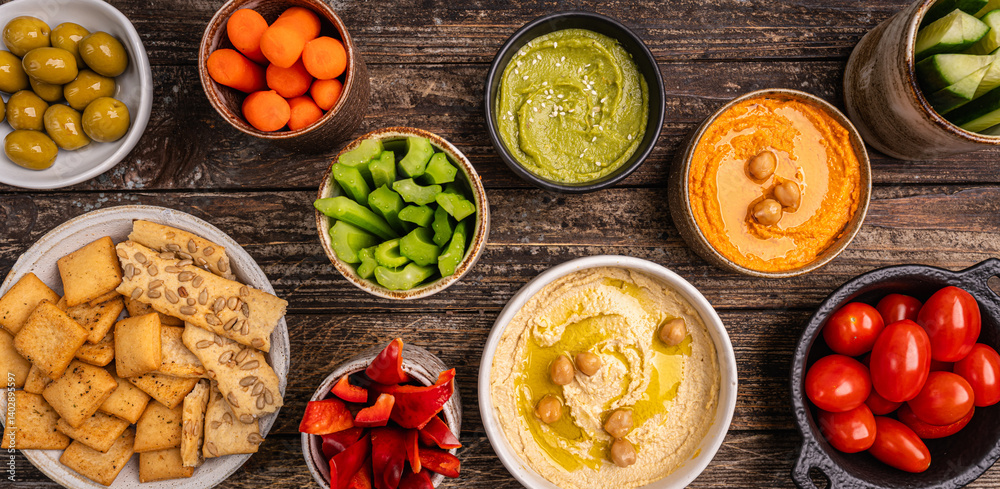 Various hummus dips. Hummus plate with vegetable snacks. Carrot, cucumber, tomato, celery sticks, dry crackers and olive, top view. Vegan and traditional hummus as healthy and vegan snack.