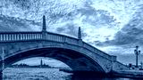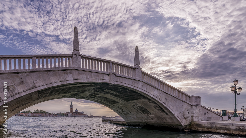 A typical Venetian bridge, Ponte San Biasio delle Catene, in the historic center of Venice, Italy, under which you can see the island of San Giorgio Maggiore