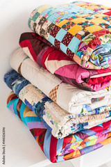magnificent colored patchwork quilt put by a pile on a white table close up. a concept with colorful scrappy blankets.