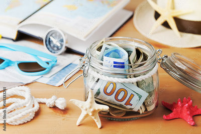 Money in glass jar on wooden table. Savings for summer holidays, vacation, travel and trip.