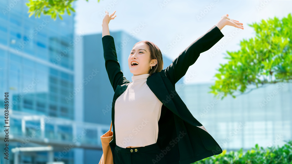両手を広げて喜ぶ笑顔の女性・ビジネスウーマン