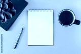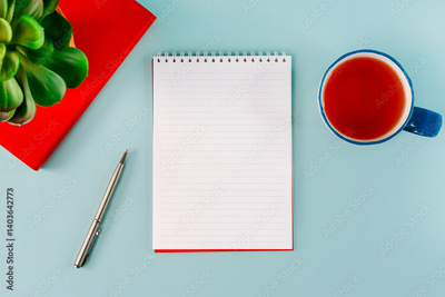 A notebook with a place for text and a spring bouquet of flowers at the workplace next to the keyboard on a blue background. Flat lay, mock up, top view, freelance concept.