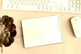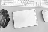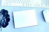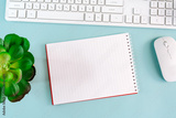 A notebook with a place for text and a spring bouquet of flowers at the workplace next to the keyboard on a blue background. Flat lay, mock up, top view, freelance concept.