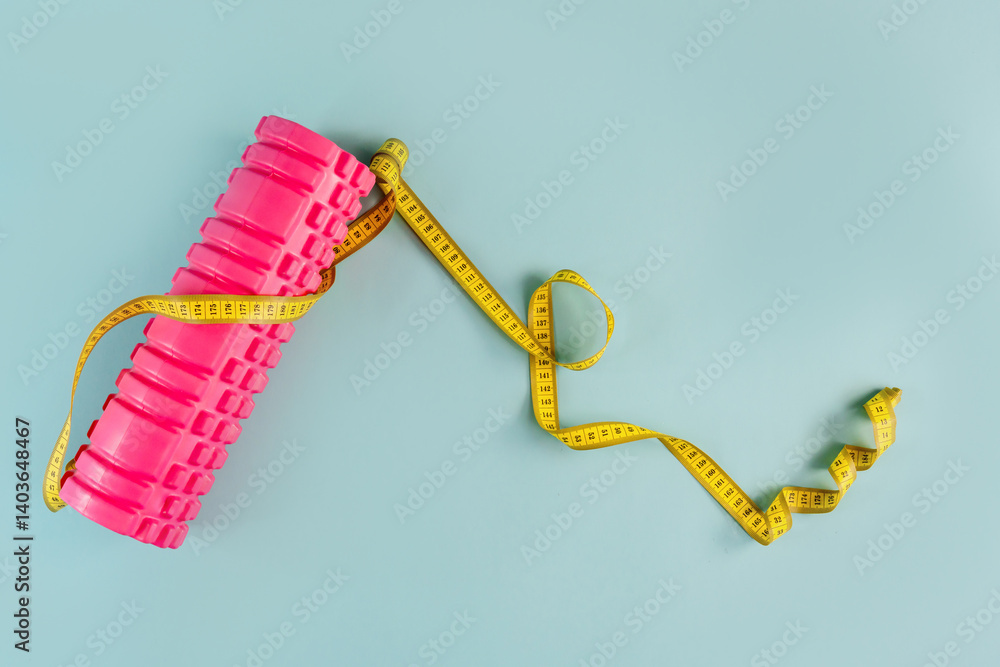 Sports roller and measuring tape on an isolated blue background, place for text, weight loss concept