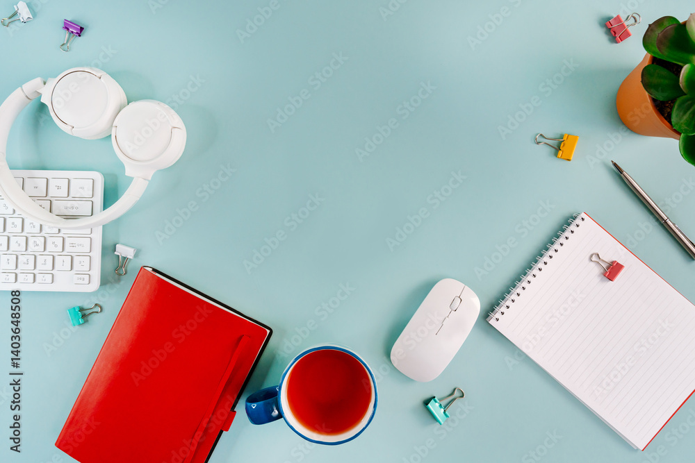 A workplace at a home office desk with a keyboard, a bouquet of flowers and a notebook on a blue background. Flat layout, top view, freelance concept.