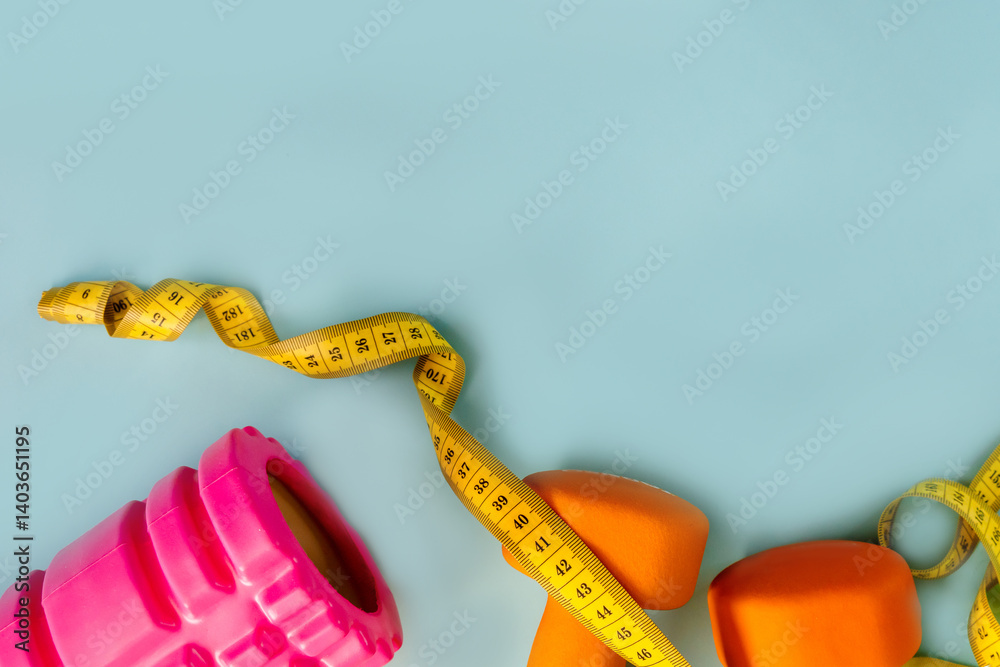 Composition with shoes, measuring tape and sports equipment and on a blue background
