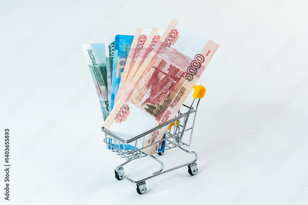 Saint Petersburg, Russia - 6 Apr 2025: Supermarket basket filled with ruble notes, shopping concept