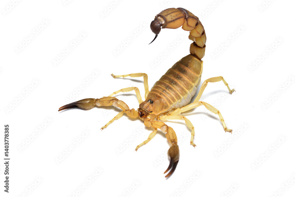 Closeup picture of the medically important yellow fat-tailed scorpion Androctonus australis (Scorpiones: Buthidae) from Tunisia, photographed on white background