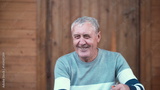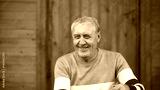 Old man sitting on the porch of the house. Grandfather making funny face and granddaughter running to him, hugs. 4K