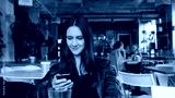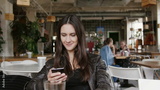 Stylish young woman uses a smartphone surf the internet sitting at a table in modern cafe, smiling. 4K