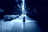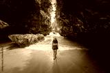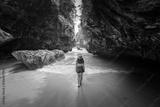 Back of girl traveler wearing hat on the beach among the rocks on Bali island. Journey to a beautiful destination
