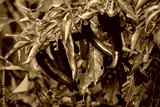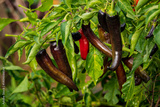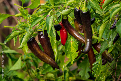 Colorful chili peppers in various stages of ripeness hang gracefully among lush green foliage