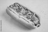 A long hot dog served in a soft bun, garnished with lettuce, tomato, and a special sauce