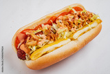 A mouthwatering hot dog rests in a bun, topped with tomatoes, lettuce, and tangy sauce for flavor