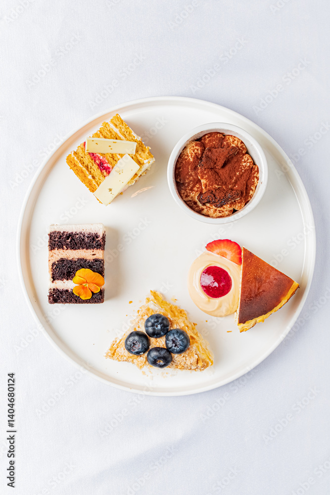 A lovely assortment of cakes and pastries presented elegantly on a white plate, perfect for sharing