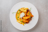 Crispy fish fillets rest atop a bed of golden fries, garnished with fresh herbs and a creamy sauce