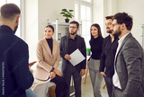 Group of business people chatting after a meeting. Company employees talking in the office. Making great decisions with brainstorming. Cowokers listen to their colleague at the working place.